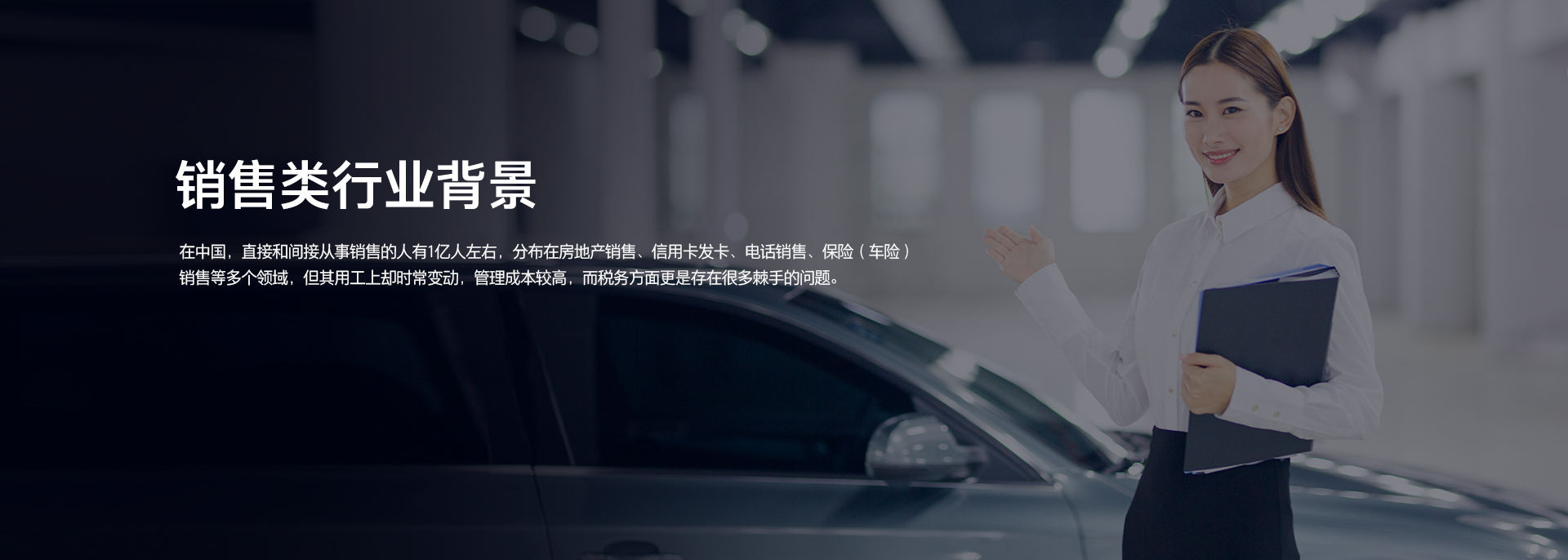 在中国,直接和间接从事销售的人有1亿人左右,分布在房地产销售、信用卡发卡、电话销售、保险(车险)销售等多个领域,但其用工上却时常变动,管理成本较高,而税务方面更是存在很多棘手的问题。